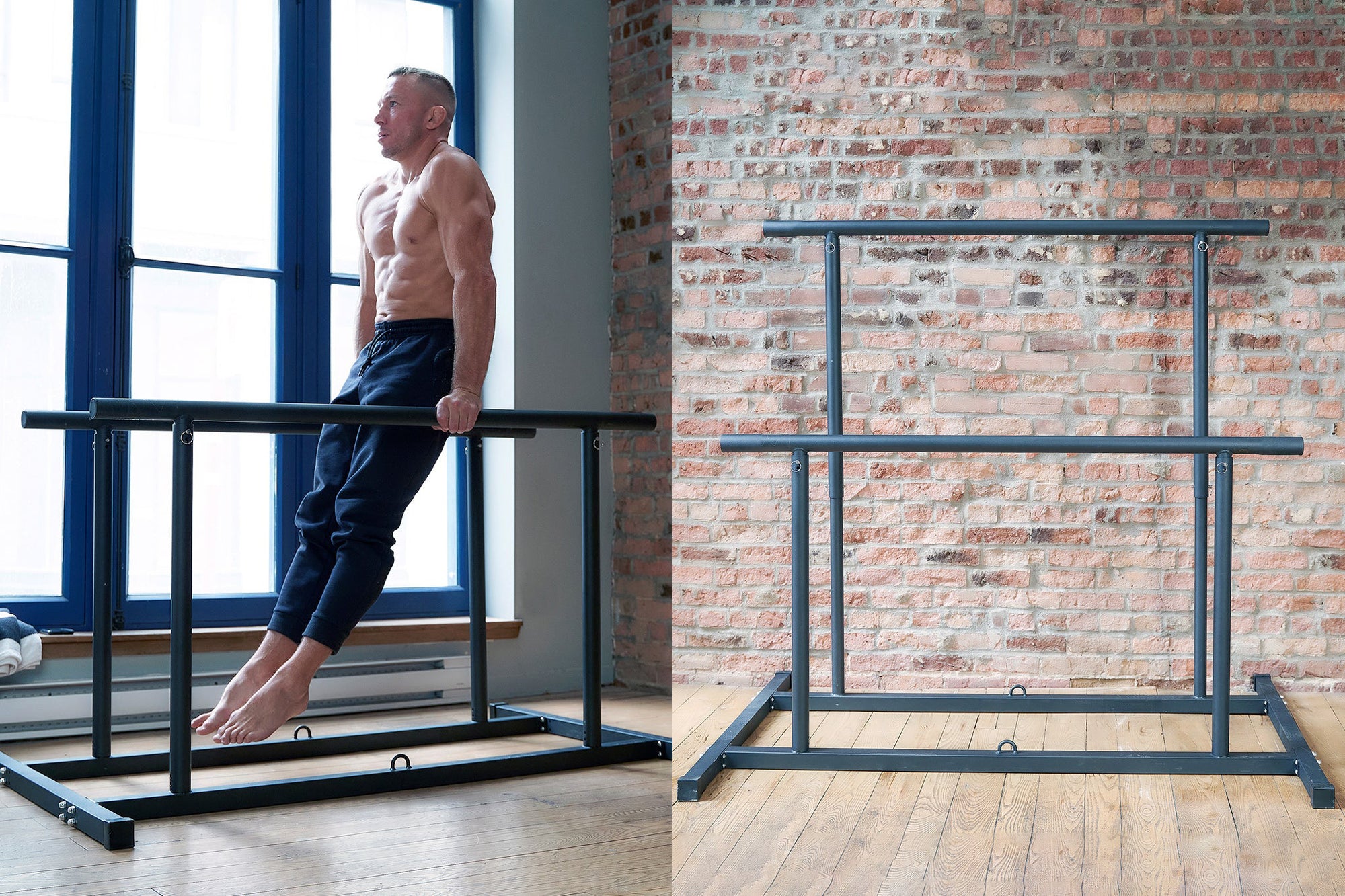 Built for explosive/swinging exercises. Assembled at three heights (20cm, 95cm and 150cm). Perform parallettes, parallel bars and high bar exercises. Requires a bit more floor space (160 x 94cm ) and is not designed to be stored after use.