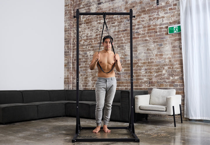 Set at 210cm. Perform pull-ups, hanging leg raises and stable enough to perform strict muscle-ups.